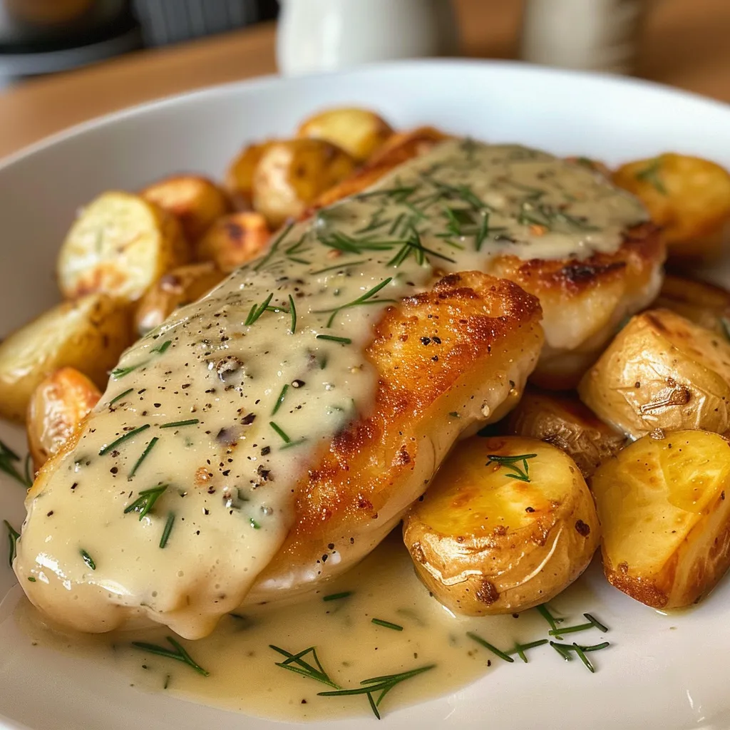 - Sirve el pollo con la salsa cremosa y las patatas en cubos.